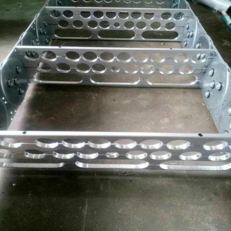 (3)單元鏈節由左右鏈板和上下蓋板組成,鋼制拖鏈每節都能打開,裝拆方便,不必穿線,打開蓋板后即可把電纜、油管、氣管、水管等放入鋼制拖鏈。