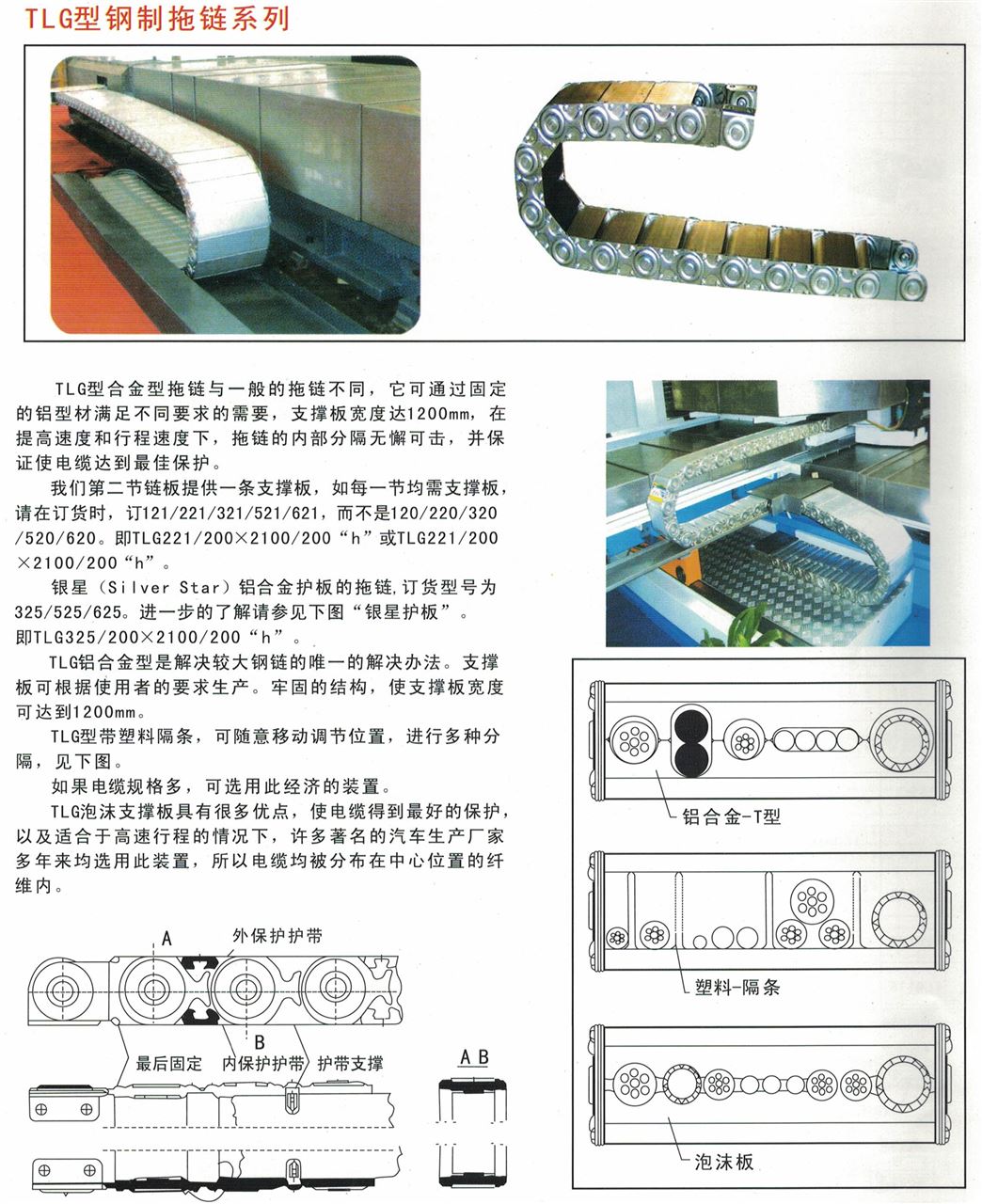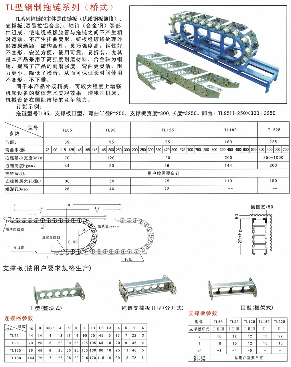 TL系列拖鏈的主體是由鏈板(優質鋼板鍍鉻)、支撐板(擠拉鋁合金)、軸銷(合金鋼)等部件組成,