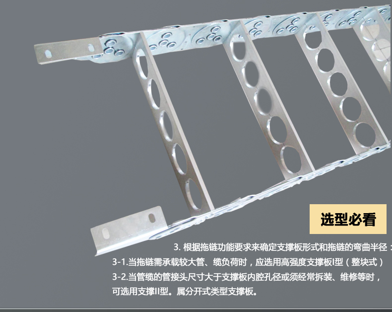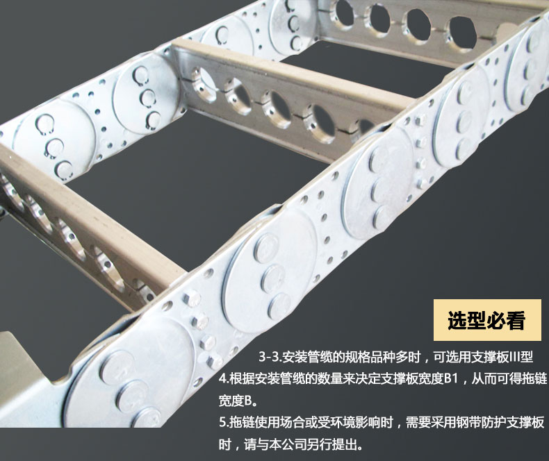 (1)當(dāng)拖鏈需承載較大管、纜負(fù)荷時(shí),應(yīng)選用高強(qiáng)度支撐板Ⅰ型(整塊式)。