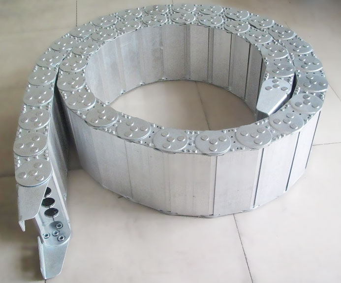 鋼鋁拖鏈的主體是由鏈板(采用優質鋼板經淬火后再拋光鍍鉻/鍍鋅/噴塑處理)、支撐板(擠拉鋁合金)、軸銷(合金鋼)等部件組成.使電纜或橡膠管與拖鏈之間不產生扭曲變形,鏈板經鍍鉻處理外形效果新穎,結構合理,靈巧強度高,該產品鋼性好,不變形.安裝方便,使用可靠,易拆裝,不下垂.由于本產品外形精美,可在較大程度上增強機床設備的整體藝術美觀效果,增強我國機床,機械設備在國際市場的競爭能力。