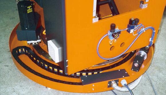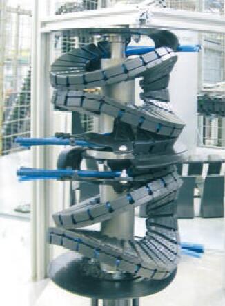 左側的照片顯示了利用“標準”拖鏈實現的旋轉運動(這里,“標準”表示拖鏈只能在一個方向上彎曲)。如果能夠提供足夠的空間,而且旋轉角度限制在 450°以內,都可使用這種解決方案。