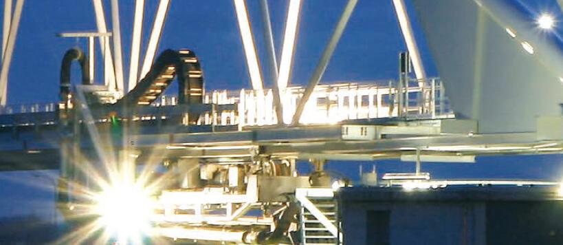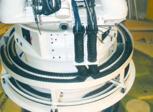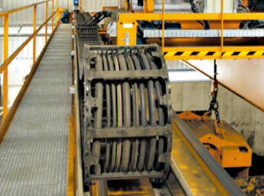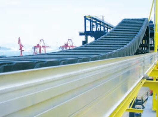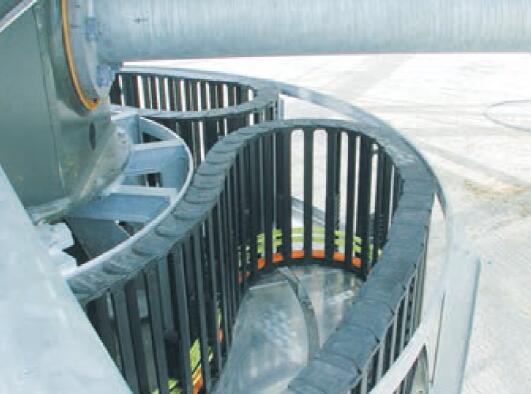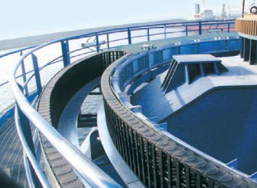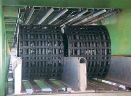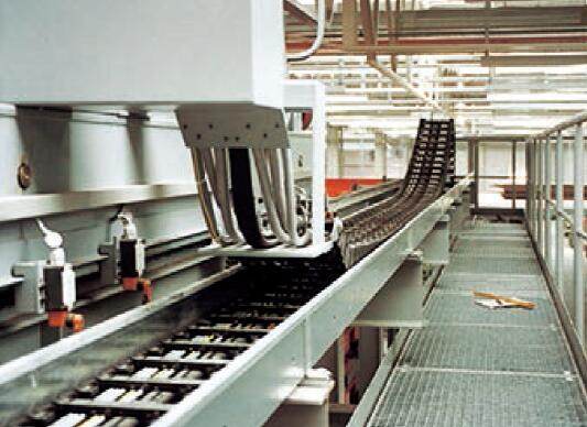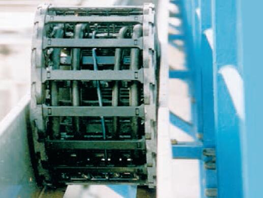 帶拓展鏈節的 E4 拖鏈用于裝船機上的煤塊裝卸。行程 105 m,速度 240 m/min,載重 53 kg/m。