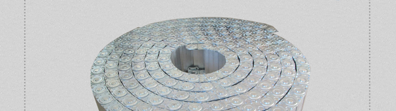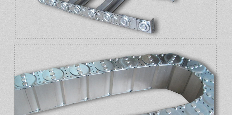 鋼鋁拖鏈的主體是由鍍鋅鏈 板(采用優質鋼板經淬火后再拋光鍍鉻/鍍鋅/噴塑處理)、支撐板(擠拉鋁合金)、軸銷(合金鋼)等部件組成.使電纜或橡膠管與拖 鏈之間不產生扭曲變形,鏈板經鍍鉻處理外形效果新穎,結構合理,靈巧強度高, 該產品鋼性好,不變形.安裝方便,使用可靠,易拆裝,不下垂.由于本產品外形 精美,可在較大程度上增強 機床設備的整體藝術美觀效果,增強我國機床,機械設備在國際市場的競爭能力。歡迎廣大廠商前來咨詢訂購。